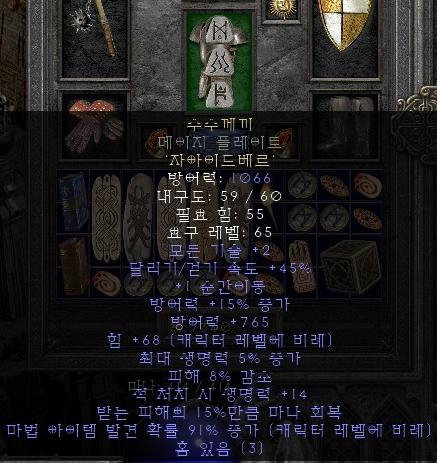 : 룬워드 작업 시 변동 옵션이 없어 마음 편하게 조합할 수 있다. 다른 갑옷도 많지만 비교적 적은 힘에 방어력이 좋은 메이지 플레이트를 쓴다. 또한 라주크 소켓 작업 시 최대 소켓인 3소켓이 뚫려서 노솟의 경우도 거래가 용이하다. 다른 변동 옵션이 딱히 없기 때문에 기본 방어력에 따라 가치가 결정된다.