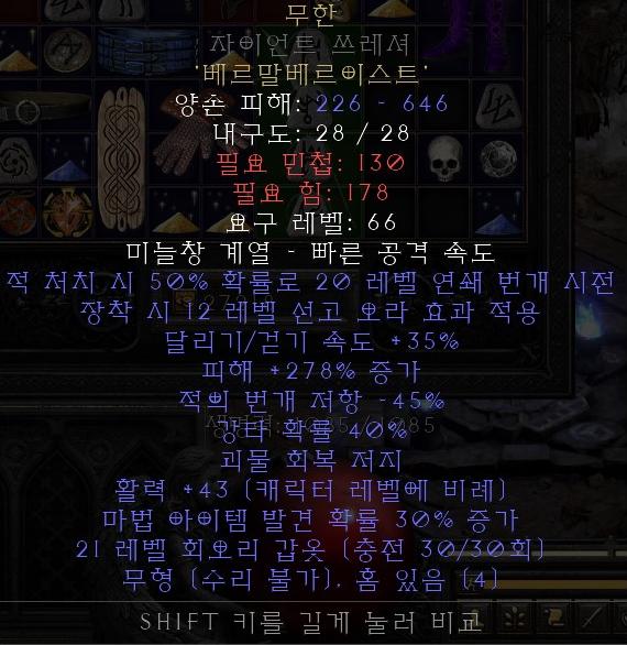 - Ctrl+F로 검색해서 찾기 - 노멀 / 익셉셔널 / 엘리트의 순서로 나열했고 엘리트로 갈수록 요구 레벨과 힘, 민첩 높아진다. - 아이템을 업그레이드 할 때 참고하자 - 최대 홈은 최대 소켓을 말한다 1